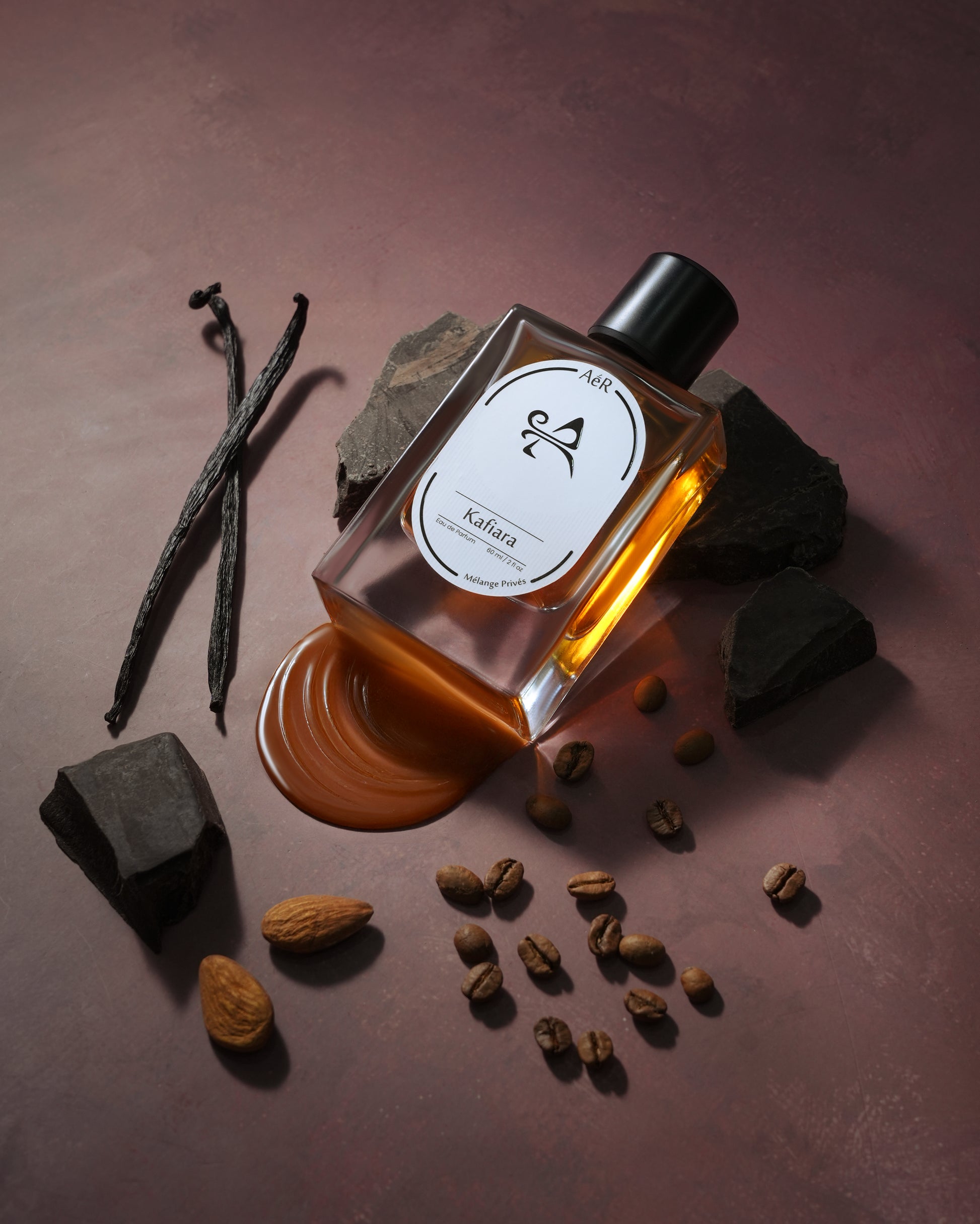 Darkness and desire intertwine in a composition of quiet power. Notes of spiced rum glide into the bitterness of roasted coffee, softened by whispers of chocolate and burnt sugar. A touch of almond drapes the blend in richness, while warm woods steady its intensity. The atmosphere is indulgent yet controlled, like a secret kept behind closed doors.